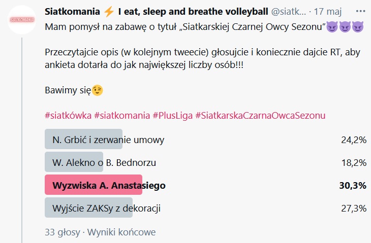 Głosowanie na 1. Siatkarską Czarną Owcę Sezonu 2020/21 odbyło się 17 maja na Twitterze. W 24-godzinnym głosowaniu wzięły udział 33 osoby. Muszę przyznać, że zdania były podzielone, a kandydaci do ostatniej chwili walczyli